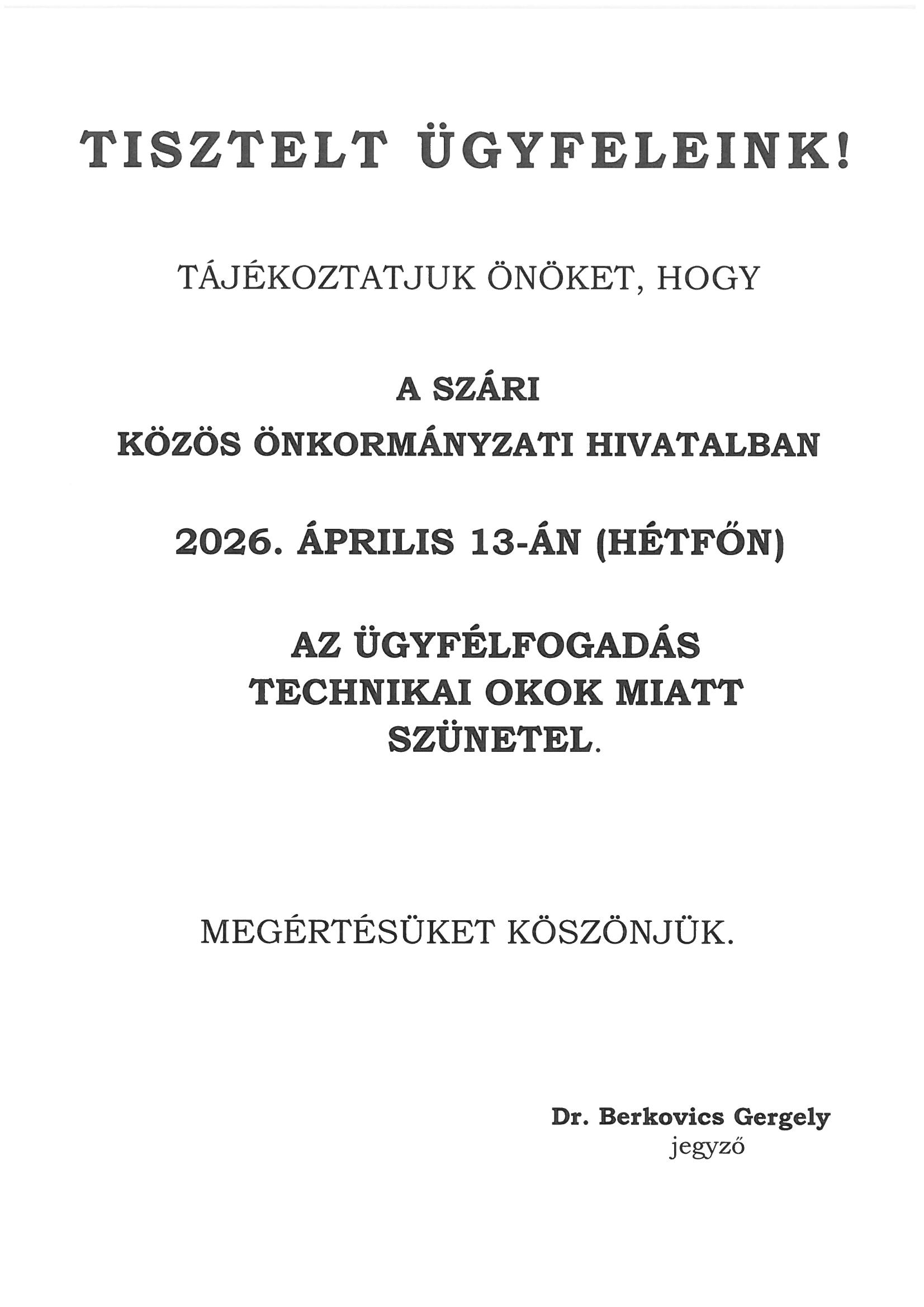 Tájékoztatás ügyfélfogadás szüneteléséről